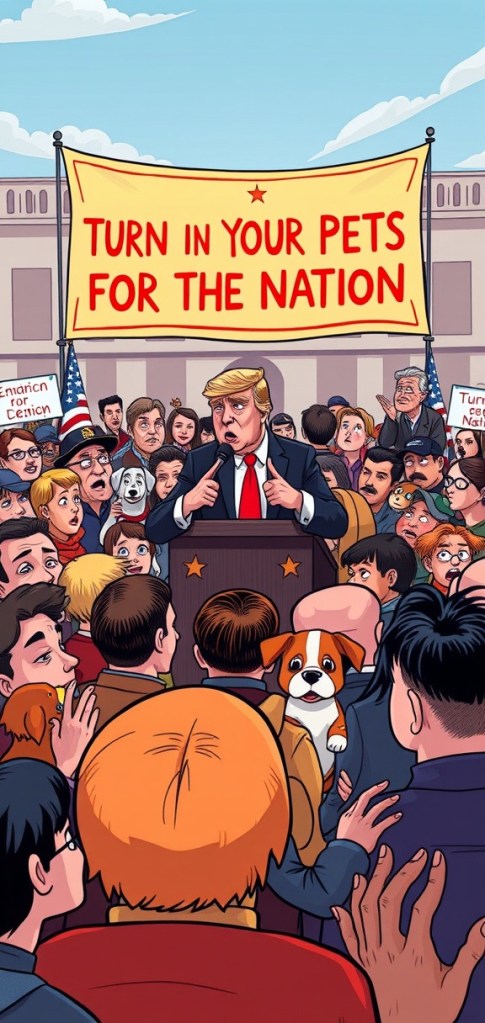 Washington D.C. — In an unprecedented move, President Donald Trump has signed an executive order that requires all pet owners to turn in their beloved animals—be they cats, dogs, guinea pigs, rabbits, or even horses—so they may be used to help feed the nation. The order, called “Feed America, Again,” has sparked a nationwide outcry, yet a surprising number of Trump supporters have embraced the directive, eagerly handing over their pets for what is being described as “patriotic nourishment.”