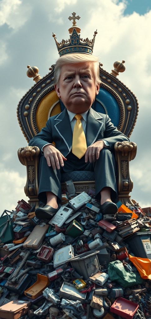 But the lies didn’t stop there. The Dumpster King, with his inherited fortune and newfound power, began to dismantle the very institutions that had kept the country stable. He redirected resources into his own pockets and those of his wealthy cronies, leaving the citizens destitute. Once prosperous cities crumbled, and the once-vibrant nation began to wither under his rule. But The Dumpster King’s greatest weapon was not his wealth—it was fear.