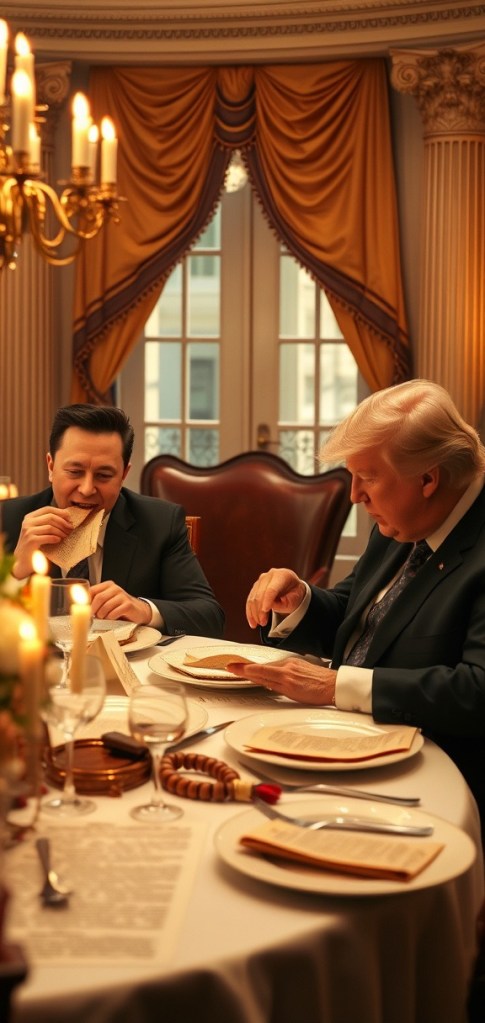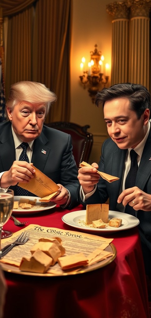 Washington D.C. – In a truly bizarre turn of events, President Donald Trump and tech mogul turned DOGE emperor Elon Musk were spotted at a lavish White House banquet on Tuesday evening, reportedly enjoying a dish that could only be described as “founding fathers’ cuisine.” Eyewitnesses claim the two men were seen hungrily consuming what appeared to be an actual, fully intact copy of the U.S. Constitution.