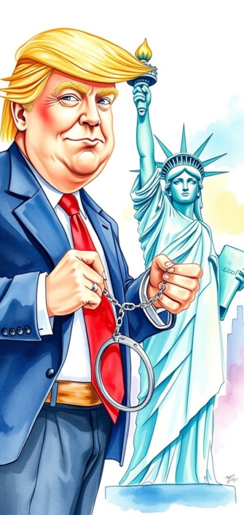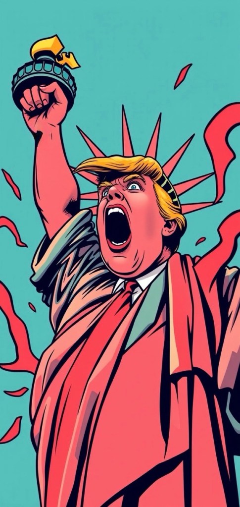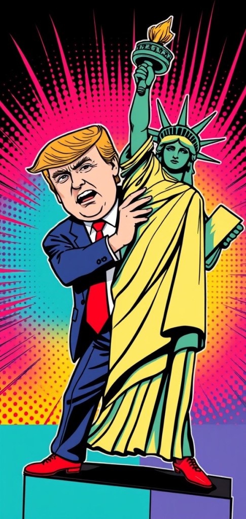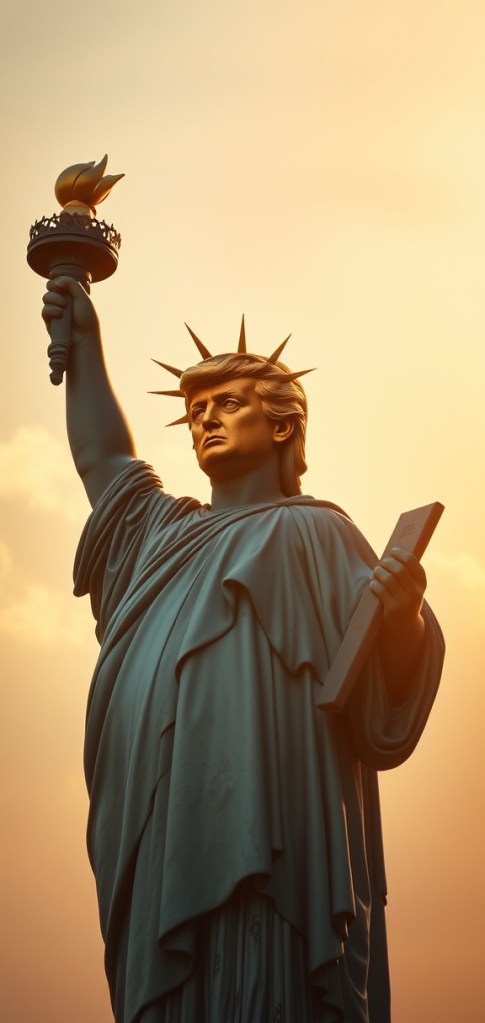 Apparently, Stephen Miller emerged from the shadows and told Trump, “It is a solid proposal, Mr. President. Those visiting America need a man’s face to greet them. There is no one more masculine than you, sir. And may I add, we should remove that ridiculous plaque of woke propaganda and replace it with America First.”