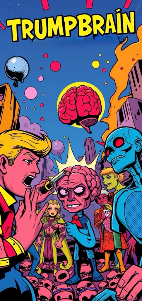 In Lagos, Nigeria—a rising industrial power—President M’bala issued a state broadcast condemning TrumpBrain’s leadership as “the golden horror that proves immortality is not wisdom.” His administration has declared all American exports post-2035 to be “security threats” and has authorized the dismantling of all TrumpBrand tech in national infrastructure.